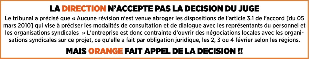 Bien que faisant appel, Orange France n’a pu s’abstenir de mettre en œuvre la décision du juge en première instance et a donc dû « inviter » les organisations syndicales représentatives de tous les périmètres concernés par le projet « Regain » afin de négocier des mesures d’accompagnement concrètes pour les salariés impactés.