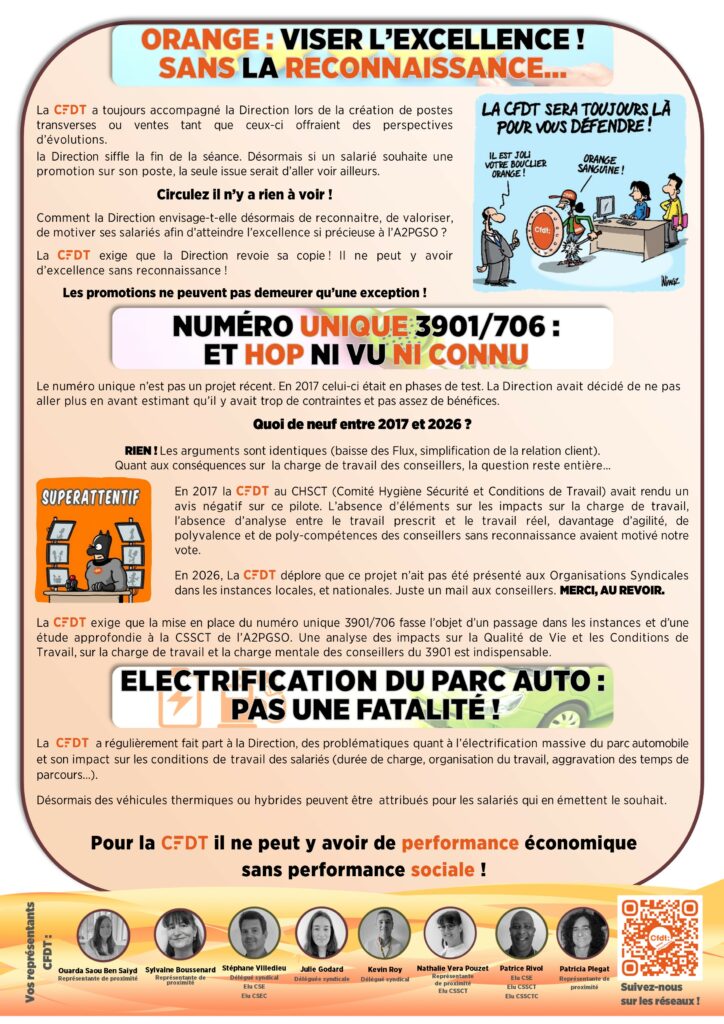 La CFDT exige que la mise en place du numéro unique 3901/706 fasse l’objet d’un passage dans les instances et d’une étude approfondie à la CSSCT de l’A2PGSO. Une analyse des impacts sur la Qualité de Vie et les Conditions de Travail, sur la charge de travail et la charge mentale des conseillers du 3901 est indispensable.